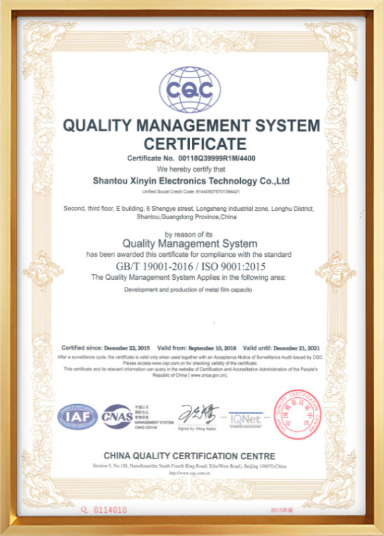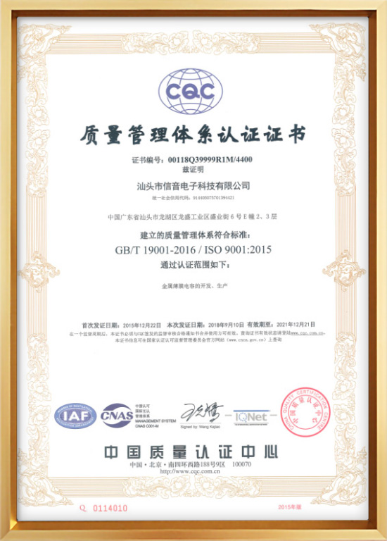 CQC质量管理体系认证证书